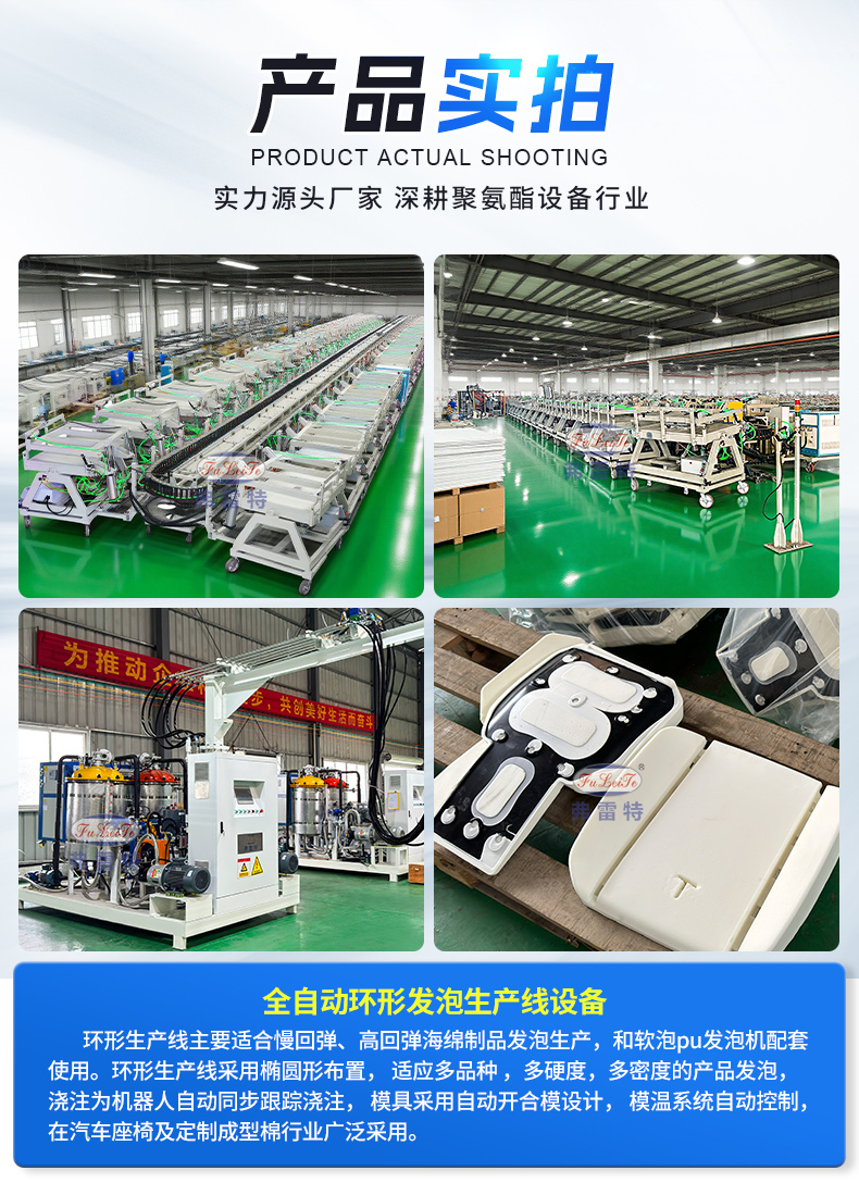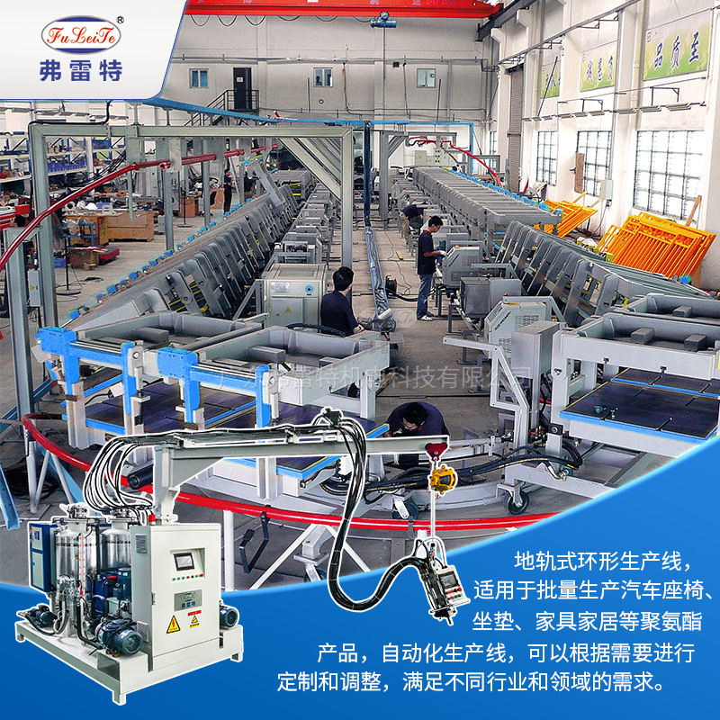 环形生产线:高效连续的典范 环形生产线是一种闭路循环输送系统,工位众多,节拍紧凑。其优势在于可实现不间断连续生产。模具在循环线上流动,不同工位完成清理、喷脱模剂、安放嵌件、浇注(由聚氨酯发泡机完成)、熟化、脱模等工序。极大地减少了等待时间,产能非常高,非常适合汽车配件、大型保温板材等大批量产品的生产。