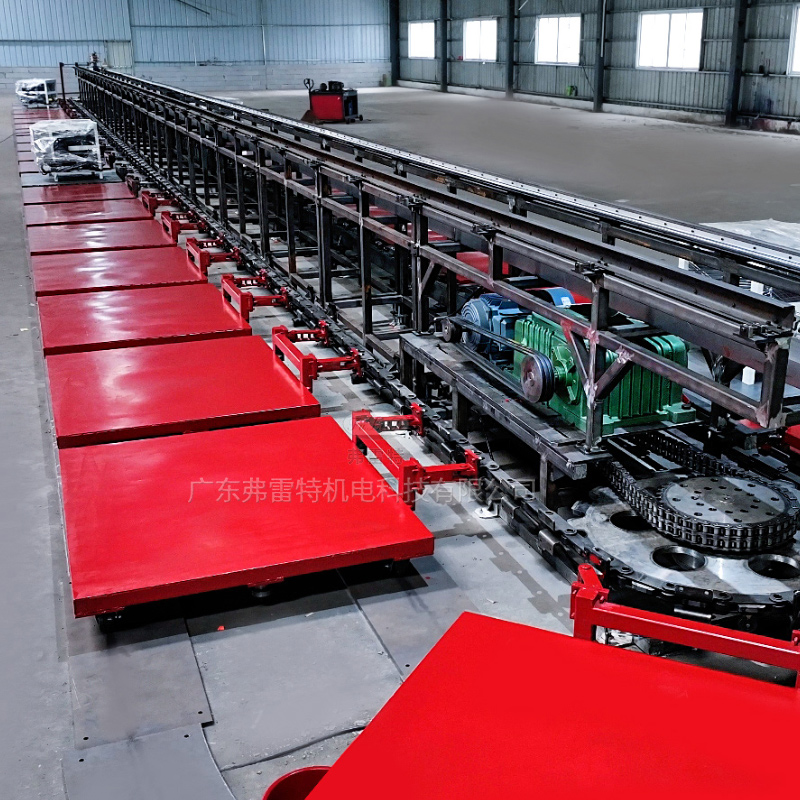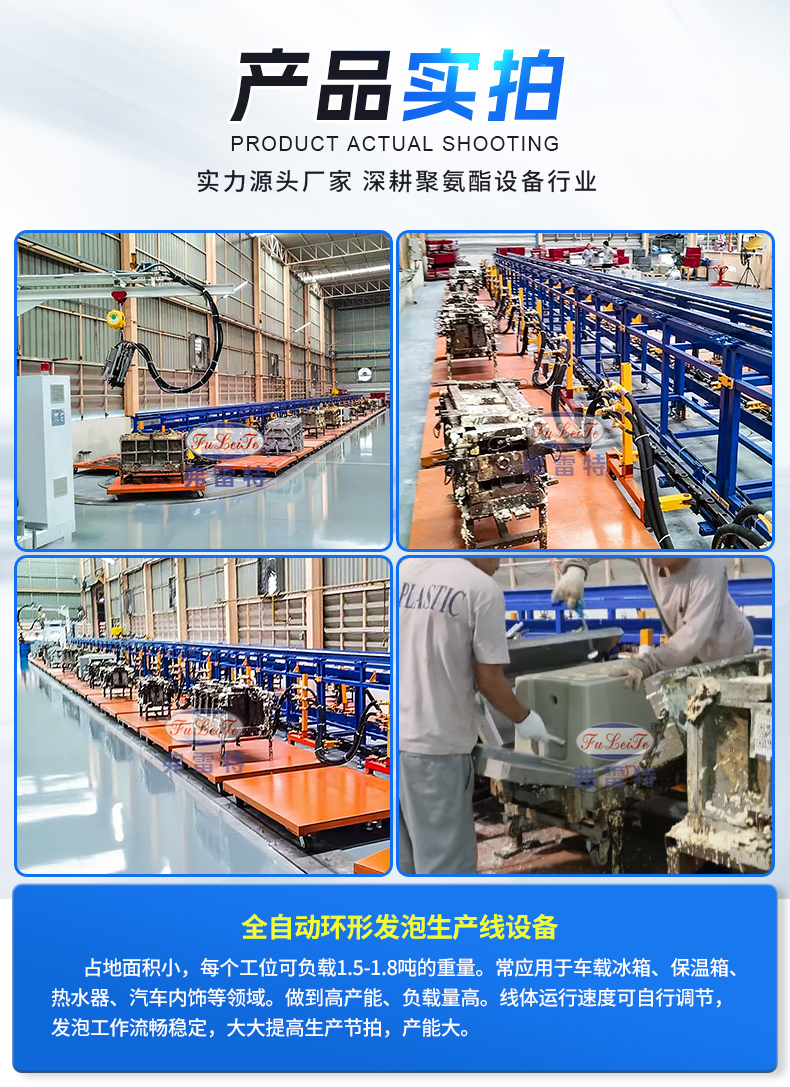这是一条长33米带有40个工位的车载冰箱大型环形发泡生产线。这条生产线的优点是占地面积小,每个工位可负载1.5-1.8吨的重量。常应用于车载冰箱、保温箱、热水器、汽车内饰等领域。做到高产能、负载量高。广东弗雷特是一家国家级高新技术企业,科技中小型企业,创新型企业和专精特新企业。