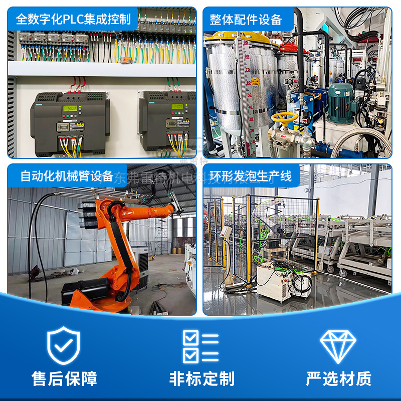 环形生产线:高效连续的典范 环形生产线是一种闭路循环输送系统,工位众多,节拍紧凑。其优势在于可实现不间断连续生产。模具在循环线上流动,不同工位完成清理、喷脱模剂、安放嵌件、浇注(由聚氨酯发泡机完成)、熟化、脱模等工序。极大地减少了等待时间,产能非常高,非常适合汽车配件、大型保温板材等大批量产品的生产。